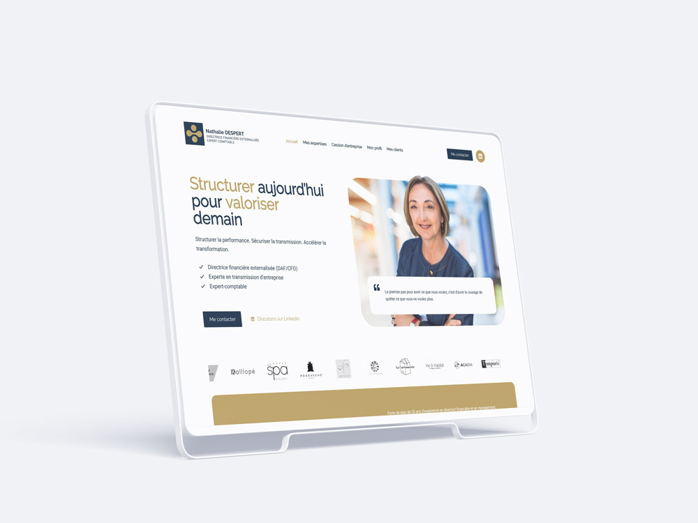 Pour ce projet, j’ai accompagné Nathalie Despert, directrice financière externalisée et experte en transmission d’entreprise, dans la création d’un site clair et structurant, à l’image de son positionnement auprès des dirigeants de PME et d’ETI.